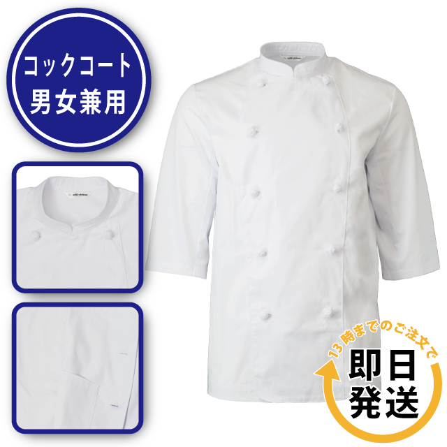厚手で汗をよく吸う綿100% カツラギ素材を使用した火を使う環境に最適な半袖コックコートです。