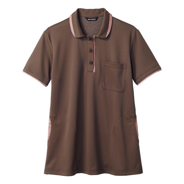 ラウンドした衿にチェック柄をあしらったブラウンのニットシャツで、好感度アップの控えめでフェミニンな装いにすると、上品で清楚な印象の好感の持てる立居振る舞いとなり、優しい心が伝わるケア・介護スタイルになります。